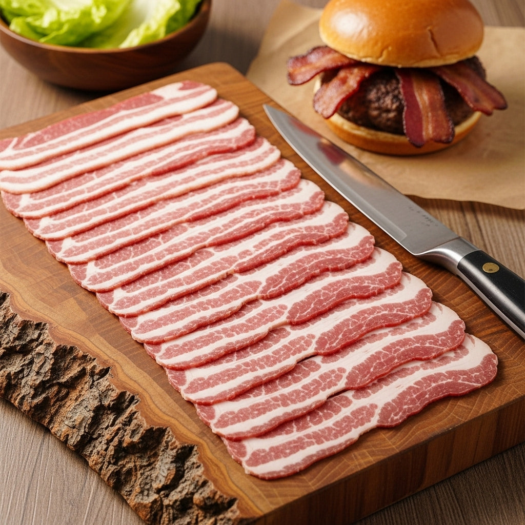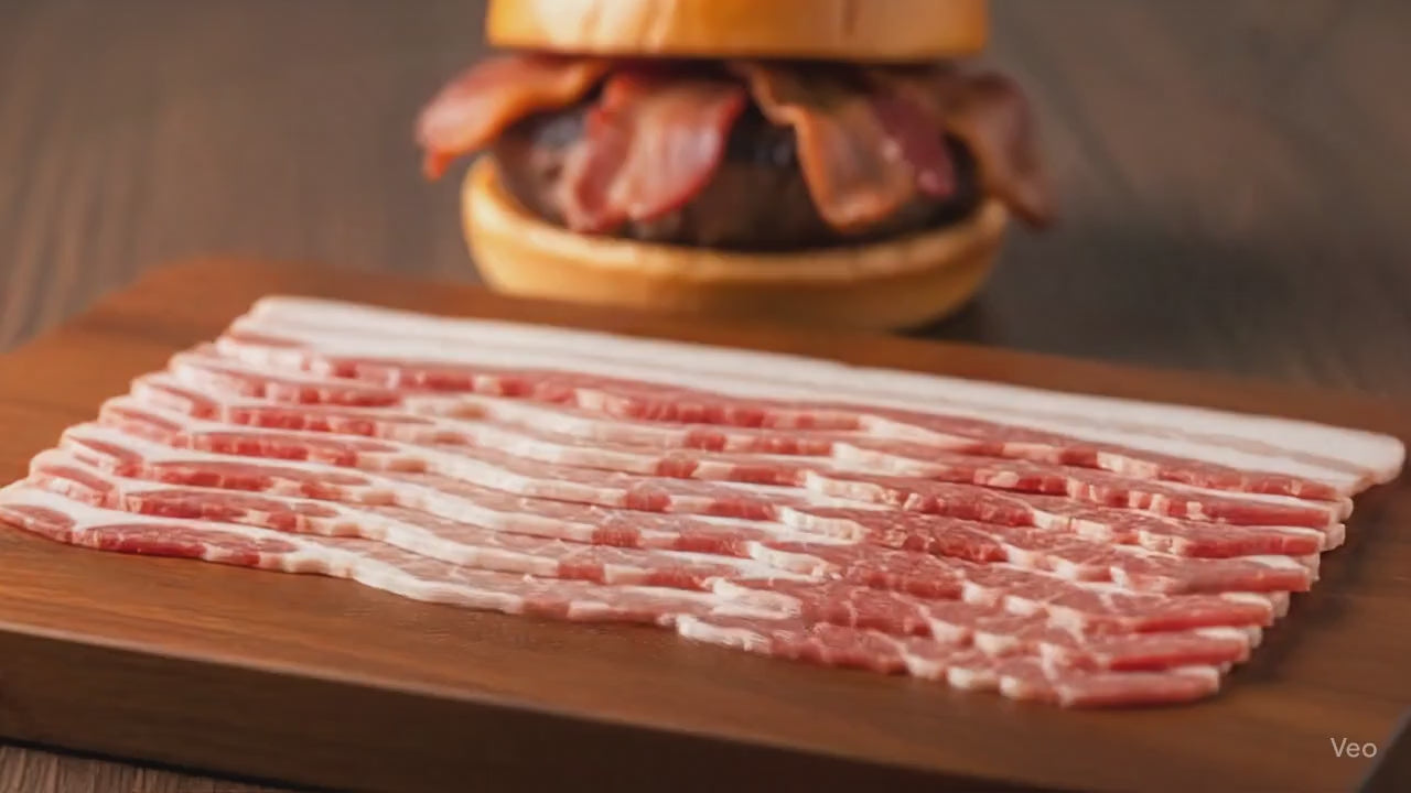 Smoky, savory Halal Beef Bacon Slices—crispy and flavorful, perfect for breakfast, burgers, sandwiches, and salads. 100% Halal certified.
